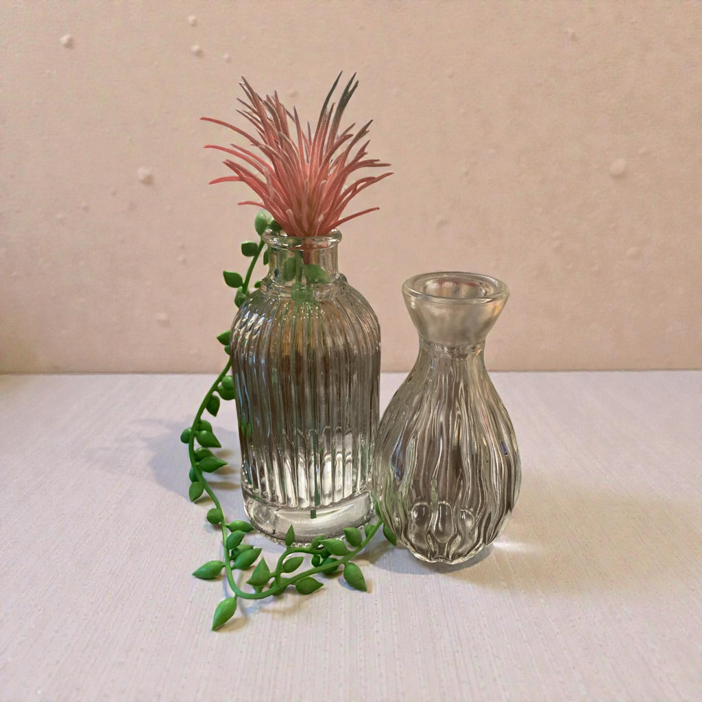 Small decorative glass vases in different shapes.  Range in height from 3 1/4 in to 5 1/2 In.  Age is unknown, but vintage apothecary styling.  Great little bud vases, diffuser or on its own.