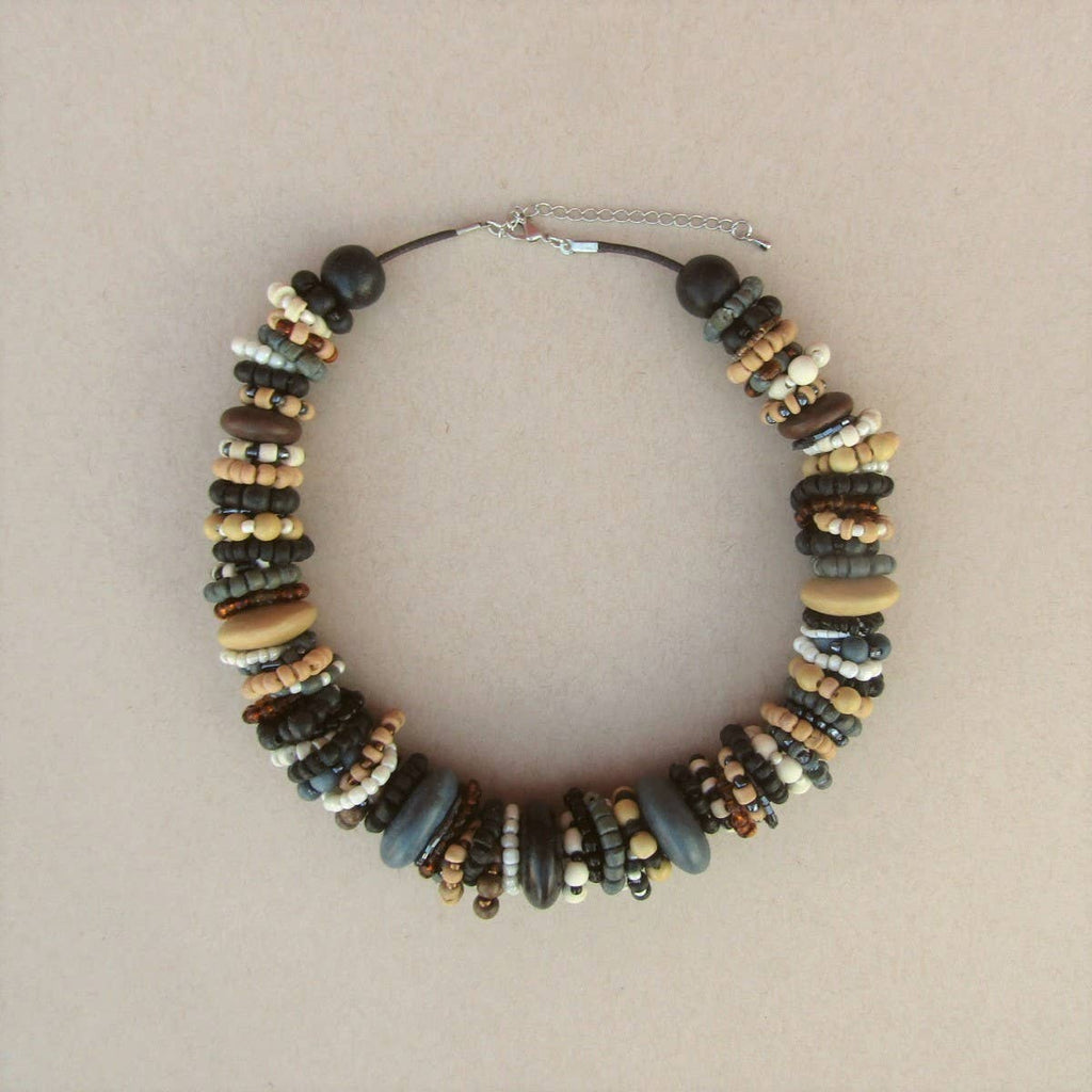 Impressive necklace in classic earthy natural colors is made up of rings of beads mixed with wood ring beads on a brown cotton cord. Gray, bronze and black mixed with ivory, white and sand.