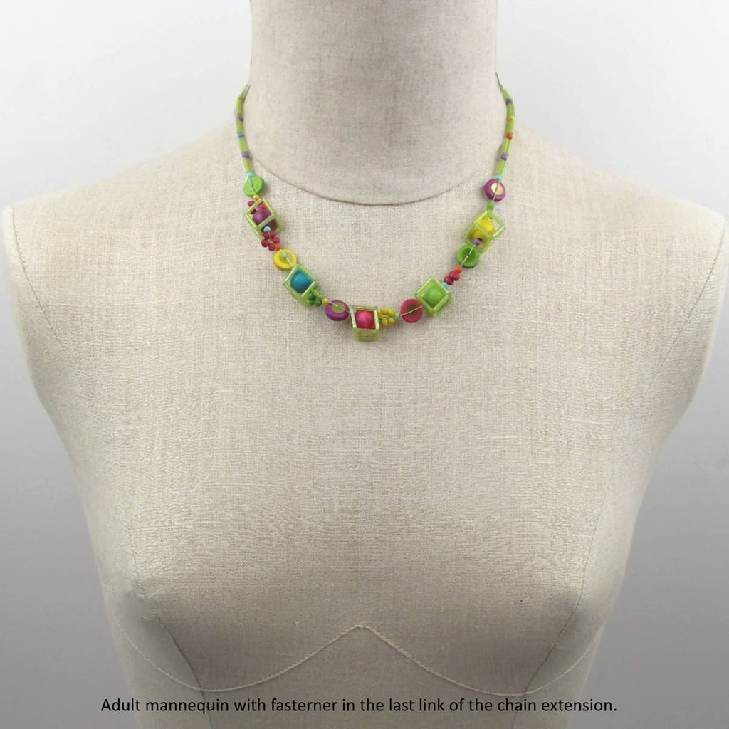 Bright colored wood beads in Heather, Turquoise, Joyful Pink and Lime Green, enclosed in boxes made from light green iridescent bugle beads, spaced with bright flat beads and little flowers made from little wood beads.