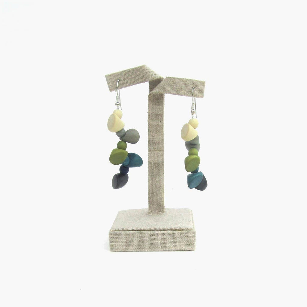 A single strand of round and pyramid shaped wood beads in beautiful graduating colors; Ivory sand, warm haze, kiwi green, pacific palisades teal, azure blue and dark blue the color of the evening sky hanging 2" from a stainless steel hook.